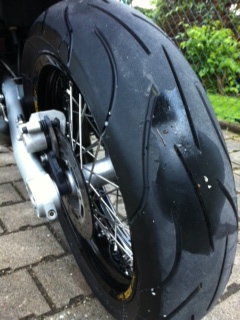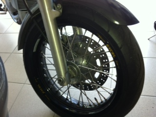 Wenn schon, denn schon dachte ich mir. Da meine Idee mit der Reifenveränderung weiter gereift war, nahm ich Kontakt mit Herrn Weibhauser von HE Motorradtechnik auf. Er berichtete mir über seine Arbeit. Eigens konstruierte Naben werden von Hand auf Excel Felgen eingespeicht. Mir gefiel, wie er über seine Arbeit sprach und ich entschloss mich, meine Moto umspeichen zu lassen. Vorne wünschte ich mir 3,5 Zoll auf 17‘ mit der Bereifung 120/70 17 und hinten 4,25 Zoll ebenfalls auf 17‘ mit der Dimension 150/60 17. Ich suchte nach den passenden Reifen. Mit der Technik von Bridgestone fand ich mit dem BT 16 einen sportlichen Reifen, eigentlich passend. Besser erschien mir aber der Michelin Pilot Power. Vielleicht nicht ganz so haltbar, aber für die Berge ein wunderbarer Kurvenräuber. Bei Fritzreifen bekam ich ein brandneues Paar, gerade erst vor ein paar Wochen produziert. Sehr gut. Die Entscheidung neue Reifen zu besorgen, machte mir Bridgestone leicht; der vorne montierte BT45 aus einer Produktion 2008 zeigte deutliche Rissbildungen an der Flanke. Das konnte ja wohl nicht wahr sein. Ich telefonierte wieder mit der Technik von Bridgestone EU. Zu meiner Verwunderung, nahm man diesen Defekt sehr ernst und bot mir an, über den nächstgelegenen Reifenhändler den Reifen einzusenden. Entsprechend der Nutzung des Reifens und bei Feststellung eines Produktionsfehlers werde man den Kaufpreis anteilig erstatten. Das fand und finde ich einen guten After Sales Service. Gesagt, getan! Am 17. Juni machte ich mich in aller Früh auf den Weg nach Freilassing zu Herrn Weibhauser. Von München ist man in gut eineinhalb Stunden dort. Die Moto schnurrte die Berge hinauf und hinab und wir hatten eine Menge Spaß. Die Hälfte der Wegstrecke ist nur zweispurig ausgebaut und bei dichtem LKW Verkehr kann man mit wirklichem Vergnügen und 100 bis 120 km/h auf der linken Spur ruhig dahinbrausen. Keine Hetze, einfach nur Spaß! Die Sonne lachte uns an, die Berglandschaft um uns herum ein Traum, schöner kann es kaum sein! Herr Weibhauser begrüßte mich mit seinem Monteur Thomas Streitwieser sehr herzlich. Wir bauten zunächst das Hinterrad aus und stellten fest, dass auf der Fahrt nach Freilassing gleich mal zwei Speichen gebrochen waren. Da die Speichen an der Nabe um fast 90° gebogen und allein davon schon sehr stark belastet werden, ist die seinerzeit von Aprilia verbaute "Lala-Qualität" der Speichen nur noch das Sahnehäubchen für diesen Speichenbruchsalat. Auch im Moto Forum hatte ich einiges über Speichenbruch gelesen, insofern: c’est la vie!