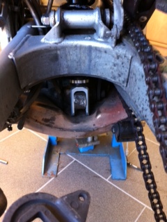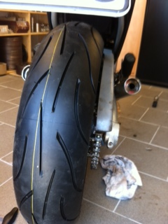 Da meine Naben noch recht gut erhalten waren, entschieden wir uns für neue Speichen und schwarz eloxierte Excel Felgen. Während Herr Weibhauser und Thomas Streitwieser die Felgen bohrten und per Hand einspeichten, machte ich mich daran das neue Wilbers Federbein einzubauen. Eigentlich ein Klacks - dachte ich. Das neue Bein ist aber circa einen Zentimeter länger als das Original Federbein. Was nun? Der Auspuff drückte von unten, ich bekam das blöde Ding nicht rein. Ich rief bei Wilbers an. In der Technik war nur ein Mann, der meine Sprache nicht spricht. Draußen schien die Sonne, es hatte 36° und ich fing ebenfalls an zu kochen. Was stimmte da nicht? War ich zu dumm, die Moto richtig aufzubocken? Das alte Federbein wieder einbauen kam nicht in Frage. Ich fahre hier nur mit dem neuen Teil vom Hof! Mein Ehrgeiz war geweckt. Ich versuchte Michael Große Börger zu erreichen. Er hatte schon so ein Federbein eingebaut und ich hoffte, dass er Rat wusste. Ich erreichte ihn und er sagte mir, dass bei ihm alles ganz leicht war. Gibt’s doch nicht denke ich mir! Wo ist der verdammte Haken? Ich löste die hinteren Auspuffschellen. Mit einem langen Montageeisen setze ich an und hebelte ganz vorsichtig zwischen Federbein und Auspuff. Ich glaubte es nicht: es geht. Langsam setzte ich die untere Schraube ein. Alles sitzt am richtigen Ort. Ich war nassgeschwitzt, aber super glücklich. Herr Weibhauser und Thomas Streitwieser machten inzwischen Druck, das Hinterrad müsste dringend rein. Schließlich sollte das Vorderrad noch gemacht werden; um 16 Uhr hatten wir einen TÜV Termin und da musste alles passen. Thomas Streitwieser und Herr Weibhauser halfen mir wo es nur ging, ohne die beiden hätte ich es nicht so rasch geschafft: 1000 Dank! Ein tolles Team, das ich uneingeschränkt empfehlen kann. Das Hinterrad mit der neuen Bereifung passte wie angegossen. Die alte Kette entsorgten wir genauso rasch, wie das Kettenrad. Da der Umfang der neuen Bereifung um einiges kleiner ist, als bei der Original Bereifung, schraubte Herr Weibhauser bei der Einspeichung gleich ein 46er Kettenrad auf.
