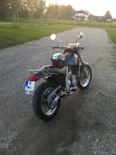 Michael berichtete mir zuvor von den Federbeinen und Federn von Wilbers, die das Fahrwerk der Moto deutlich verbessern sollten. Ich telefonierte mit dem Vertrieb von Wilbers und bestellte Federn und auch das passende Federbein, welches speziell auf mein Gewicht und meine Wünsche angefertigt wurde. Ein Foto aus dem Netz ging mir nicht mehr aus dem Kopf: eine Moto mit flacheren und deutlich breiteren Reifen. Diese war auf irgendeinem Treffen gegen ein paar Dukes angetreten. Das gefiel mir sehr gut, zumal die Originalbereifung mit einer Reifenhöhe von 90% wirklich nicht mehr zeitgemäß war und auch das Fahrvergnügen mit niedrigerem Querschnitt deutlich zunimmt. Michael erzählte mir von seiner Umspeichung und das er damals alles ganz gut eingetragen bekommen hätte. Aber ob das heute auch noch klappen sollte? Im Netz fanden wir den Umspeichbetrieb von HE Motorradtechnik. Der Betrieb von Alois Weibhauser liegt unmittelbar an der Österreichischen Grenze in Freilassing und hat sich auf die Umspeichung und Gestaltung von Naben, sowie Fahrwerksteilen spezialisiert. Aber dazu später mehr. Erst einmal musste ich die Moto anmelden. Versichern konnte ich sie recht schnell, das geht ja heute online und auch recht günstig. Aber was würde ich mit dem Kennzeichen machen? München Stadt ist da nicht so kooperativ, wenn man sich eine kurze Zahlen- und Buchstabenkombination wünscht. Nach einigen Telefonaten hatte ich meine Initialen und zwei Ziffern. Sehr gut. Was doch mit Höflichkeit alles zu erreichen ist... Das Wetter wurde besser und endlich konnte ich eine erste Runde drehen. Benzinhahn auf und ich war gespannt was passieren würde. Zwei Startversuche und sie blubberte sauber vor sich hin. Ich packte das Öl und den Frostschutz ein und machte mich auf den Weg von München nach Peissenberg, wo ich bei einem Freund in der Werkstatt die nötigen Arbeiten erledigen konnte. Wir fuhren durch die Stadt, dann auf die Autobahn, Richtung Starnberg. Alles lief gut. Auf der Landstraße freundeten wir uns besser an. Es ging in die ersten Kurven und Stück für Stück gewöhnten wir uns aneinander. In Peissenberg war das Öl schön warm. Ich gab ein wenig der Motorspülung in den Öltank, ließ den Motor einige Minuten laufen, damit die Schmutzreste gelöst wurden und ich alles beim Ölwechsel heraus hatte, was dort nicht hingehört. Nach Abstimmung mit der Technik von Liqui Moly verwendete ich die Hälfte der angegebenen Mengen, damit es keine Probleme mit der Nasskupplung gab. Der Wechsel verlief problemlos, so weit man das sagen kann. Na ja der bekannte obere Ölablass spritzte ganz ordentlich. Da ich bezüglich dieser Öffnung von Michael vorgewarnt wurde, hat es zwar geschmiert, aber es hielt sich in Grenzen. Für die nächste Runde bin ich noch besser präpariert, ich werde eine Art Trichter vor die Schraube halten, der dann direkt in einen Altöltank läuft. Der Rest lief unten aus dem Motor, der Reiniger tat seinen Dienst und alle Schmutzreste liefen mit dem Altöl perfekt aus dem Motor. Ich wechselte Filter und Öl. Mit 5W 40 schnurrt sie sauber und auch die Kupplung macht keinen Mucks. Auch heute, nach einigen Kilometern sieht das neue Öl immer noch sehr sauber und unverbraucht aus. Anschließend spülte ich den Kühler, samt Motorleitungen und den Überlaufbehälter gründlich aus. Ich füllte frischen Frostschutz ein und baute alles wieder gut zusammen. Glücklich fuhren wir beide heim. Die nächsten Kilometer spulten wir mustergültig ab. Tags darauf habe ich begonnen die Moto zu waschen. Mit fiel der recht blinde Scheinwerfer ins Auge. Ich baute das gute Stück aus und sah sehr schnell, dass hier wohl zu viel Strom angelegen hatte. Der Glühlampenstecker war vollkommen mit den zuführenden Kabeln verschmolzen. Das sah nicht gut aus. Ich besorgte ganz schnell einen neuen Stecker, konfektionierte die Kabel neu, säuberte und polierte den Scheinwerfer von innen, sowie außen sehr sorgfältig. Mit einer Night Braker plus von Osram sehe ich nicht bis an das Ende der Welt, aber doch schon sehr ordentlich! Ich schaute mir die Kette an. Diese erschien mir zu locker und ich spannte sie ein wenig nach. Bewegte ich das Hinterrad um eine viertel Umdrehung, war die Spannung so stark, das alles nur noch knackste. Was war das denn? Es zeigte sich, dass die Kette ungleich gelängt war. Die war im wahrsten Sinnes des Wortes hinüber. Ich musste schnellstens Ersatz besorgen.