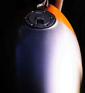 Da der Tank leider überhaupt nicht magnetisch ist, kommt als Tankrucksack nur einer mit Riemen in Frage. Auch da hat sich Aprilia (oder Starck?) was ausgedacht, das ist aber höchstens für dicke Brieftaschen geeignet (viel mehr geht auch nicht rein). Gut paßt der Enduro-Tankrucksack von Polo, der gerade zum Schnäppchenpreis von 25€ zu erstehen ist. |