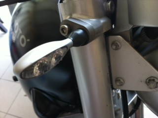 In den nächsten Tagen kribbelte es wieder in meinen Fingern; die Blinker der Moto gefielen mir nicht so richtig. Tagsüber sieht man sie kaum und wenn Omi mal hinter mir fährt und mit 9,5 Dioptrien eh recht wenig sieht, sollten meine Blinker doch was hermachen. Polo, Louis und Hein hatten sehr schöne Sachen im Regal, aber Standardmäßig wollte keiner der Blinker passen. Gibt’s doch wieder nicht dachte ich mir. Philippe, wenn ich Dich erwische, warte Bürschchen, was hast Du Dir nur bei der Konstruktion gedacht? Ich schaute im Netz, was es sonst noch gibt. Kellermann, allseits bekannt und in der Nähe von Aachen ansässig, hatte sehr schöne Micro 1000 im Programm. Sehr schön, sehr hell, sehr gut verarbeitet und sehr teuer. Leider auch ohne passenden Adapter, mit dem ich die Dinger vorne befestigen könnte. Hinten würde mir ja noch was einfallen, aber vorne? Herrjeh! Die Befestigung an der Gabelbrücke ließ mich verzweifeln. Weder der Service von Kellermann wusste Rat, noch in den Zubehörläden von Gericke bis Polo hatte man eine Idee. Eine kleine Krise baute sich zwischen meiner Süßen und mir auf. Als ich an einer roten Ampel halten musste, stand plötzlich eine Duke neben mir. Nicht nur dass der Typ schicke kleine Blinker hatte, nee der hatte auch noch blitzende Stahlflex Bremsleitungen. Bevor ich ihn ansprechen konnte war es grün, die Duke auf und davon und ich hatte immer noch keinen Plan. Ich setzte einen Hilferuf im Moto 6.5 Forum ab. Gleich am nächsten Tag hatte ich Post von einem gewissen Joe Klugmann. Joe hatte mir Fotos aus Metall gefräster Adapter für die Moto gesendet. Das sah 1a aus. Ich mailte und fragte ihn, wie und wo er die schönen Teile bekommen hatte und wie ich denn an so etwas kommen könnte. Ein paar Tage später bekam ich wieder Post von Joe. Er schrieb mir, wie er seinerzeit vorgegangen war. Danke Joe! Da ich keine Drehbank mehr zur Verfügung hatte, musste ich nach einem Fachbetrieb Ausschau halten, der mir helfen konnte. Ich suchte im Münchner Umland einen Fräsbetrieb, der mir vier kleine Adapter fräsen würde. Das stellte sich als gar nicht so leicht heraus, da die meisten Unternehmen nur noch Großserien fertigen wollten und ihnen vier kleine Adapter als zu profan erschienen. Na ja, wenn man vor Kraft nicht mehr laufen kann, dachte ich mir..
