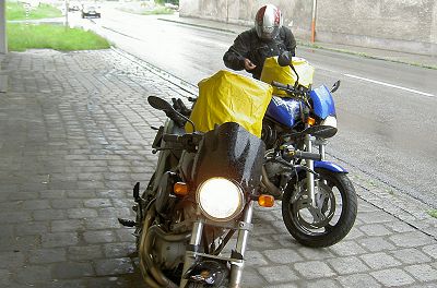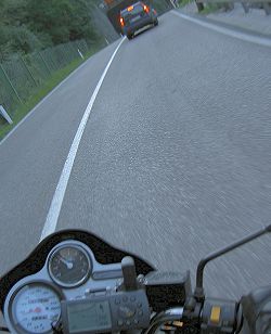 Aus dem Guss wurdn Tropfen, wieder auf die Sitzbänke geschwungen, dann sauber immer mit dem falschen Rand der Regenfront in Richtung Sonne gefahren - exakt in der Geschwindigkeit der Regenfront. Sowas gibt's doch nicht! 500m voraus kein Regen und wir voll in der Nässe! Vor uns fast nur rumschnarchende Rentner in BMWs, die das Überholen fast unmöglich machen. Ich musste grinsen, als mir die ängstlichen Fragen der heldenhaften Streetfighter aus dem Buell-Forum einfielen, die immer genau wissen wollen, ob man denn "offen" durch Bayern fahren könne. Solche Gedanken helfen beim Verdrängen des unangenehmen Gefühls, wenn das kalte Wasser langsam in den Schritt sickert.