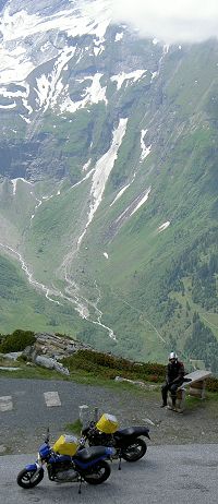 OK, jetzt ist endlich richtiges Fahren angesagt. Die Tankfüllungen werden jetzt ohne Pause abgefackelt. Den Großglockner (boah - teuer! Und beeindruckend) raufgestürmt und ganz oben etwas verwundert über die Massen von Mopeds noch zwei Plätzchen zum Parken gefunden. Komisch nur, dass um uns herum alle Sorten von Triumphs standen. Interessant. Oh - böse Blicke! Da haben wir uns genau in dem Moment mittenrein geparkt, als die Jungs vom Triumphclub das Superfoto von 50 blitzblanken Triumphs auf dem Großglockner machen wollten - und mittendrin wie ein Krebsgeschwür zwei völlig eingemistete Buells mit unförmigen Tankrucksäcken. Pech, Jungs!