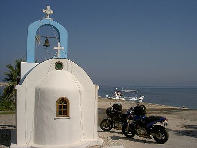Gleich nach dem Frühstück wurden die Mopeds aus der Hotelhalle rangiert, um das nicht in der Hitze und voller Montur zu machen. 50€ incl. Frühstück, obwohl 85 ausgezeichnet waren, waren OK. Schwer bewachtes Parken gratis. Es scheint, dass der gemeine Tourist das griechische Festland meidet. Jedenfalls kamen noch keine Busse und wir und zwei andere waren die einzigen Gäste im 100-Betten-Hotel.