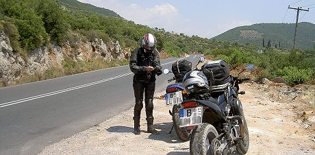 Irgendwo am Strand nahmen wir noch einen Frappé und Wasser ein und viele, viele Kilometer weiter in der heißen Pampa (> 40°) bei einem schattenlosen Ausblickgenießungs- und Petra-muss-rauchen-Stopp den dampfenden Hinterreifen, der so viel aushalten muss, mit einem freundschaftlichen Klapps getätschelt. Was ich hier außer Motorradfahrer auch nicht sein will, ist Reifen.