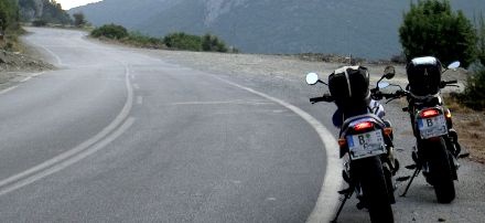 Wieder ging es über hunderte Kurven und beeindruckende Serpentinen runter nach Kalamata, dann wieder quer durchs Land zur Westcoast of Pollopenis. Die Sonne stand schon 3 Meter achtzig überm Meer, da fanden wir direkt am Strand ein Hotel. Die Motorräder sollten unbedingt im Küchenvorraum abgestellt werden, da hat sich der Wirt platzmäßig schwer verschätzt und wir vertrauten auf unsere Slum-getestete 5-Kilogramm-Hyperhard-Kette und banden sie draußen schließlich aneinander.