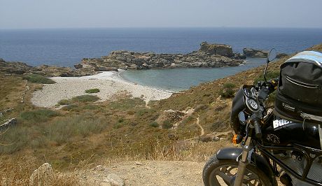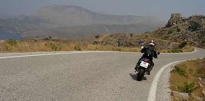 Petra nimmt ebenfalls alles gelassen - ihre 4 Jahre in der Wüste machten hart. Der Tausch der Mopedklamotten gegen T-Shirt und Schlabberhose kommt schon deshalb nicht in Frage, weil wir gar keine Möglichkeit haben, die Sachen unterzubringen. Also munter weiter in die Kleidung transpiriert und die Berge auf entweder rutschigen oder löchrigen Straßen in vielen Kurven umfahren und manchmal drüber hinweg. Dann und wann kamen wir durch ein Dorf am Meer, öfter durch in der Mittagshitze brütende menschenleere Bergdörfer. Aber immer um irgendwelche Tölen herum, die in die Reifen beißen wollten.