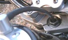 Hohle Schraube auf LenkachseDie Tankentlüftungsschlauch geht normalerweise irgendwo unter den Tank - speziell bei montiertem Tankrucksack ist er schnell mal abgeklemmt und der Motor leidet auf Dauer Durst - was er gerne mal mit Klemmern quittiert. In Enduromanier geht der Schlauch jetzt durch die hohle Schraube ins Lenkrohr. Das hat natürlich keine Verbindung zu den Lagern somit kann auch kein Schmierfett ausgeschwemmt werden. Bei den alten Buellen mit Neimann-Schloß hat es Verbindung, deshalb fliegt auch von unten Sand ins Lenkrohr und dann in die Lager, wenn man es nicht unten zu macht. |