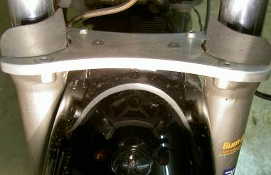 GabelstabilisatorDer extrastabile Stabilisator zwischen den Standrohren hat mehr Aufgaben als das Schutzblech (sorry: Fender) zu halten. Zusammen mit der Achse verhindert die verstärkte Ausführung noch besser ein Verdrehen beim Bremsen und sorgt für Parallelität. Ganz pragmatisch ist der Vorbau am Stabi, der den kleinen Fliegenabweiser hält. Damit wird der Simmerring geschont, der an Sommerabenden zu sehr damit beschäftigt wurde, Fliegenleichen vom Standrohr zu schaben. |