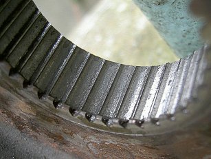etliches erleichtert und anschließend verzinkt. Beim Anbau kam etwas Loctite auf die Verzahnung, um die häufig auftretende Sprocketkaries zu verhindern. Dabei arbeitet sich die Verzahnung der Getriebewelle bedingt durch Vibrationen und Lastwechsel in die Gegenverzahnung, so dass diese irgendwann so weit abgenutzt ist, dass die Getriebewelle leer im Sprocket dreht (Bild ist unten). Ein leichtes Sprocket mit weniger Masseträgheit und kann diesen Effekt verhindern. | ![]() |