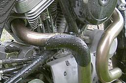 SchienbeinröstschutzMit diesem treuen Begleiter aus schwarz eloxiertem Alu fahre ich schon seit Jahren rum. Wenn ich mal alte Buells mit diesem plumpen Riesenblech am Krümmer sehe, merke ich erst, wie unglaublich filigran, praktisch und leicht das Blechle ist. Trotzdem sind kaum Löcher in die Regenkombi geschmolzen. |
