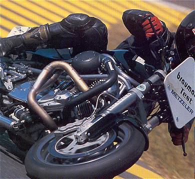 »Was aus Fahrersicht sportlich zu nehmen ist. Denn mit einem alles verzeihenden Wieselfahrwerk sollte der Buell-Käufer nicht rechnen. Durch den recht hoch eingebauten Motorblock gibt sich die Lightning kopflastig. Das verleiht ihr eine klar führbare Richtungsstabilität aber zugleich auch eine gewisse Behäbigkeit, wenn die kurz angesetzten Kurvensteps gefragt sind. Der Buell-Stier will bei den Hörnern genommen werden. Ein Bild, in das sich die knochig ansprechenden Federelemente nahtlos einfügen. Insgesamt ist die Buell ein überaus unterhaltsames Motorrad. Motorseitig ist sie ein echtes Erlebnis. Denn kein Hersteller bietet in dieser Klasse ein auch nur annähernd vergleichbares, mit reichlich Schwungmasse gesegnetes Langhuberlebnis. Vor allem bei Lastwechselbetrieb zieht diese altertümliche Motorkonzeption ihre Trumpfkarte. So wunderbar weich und geschmeidig wünscht man sich Gasgriffreaktionen bei den anderen Testkandidaten.«
