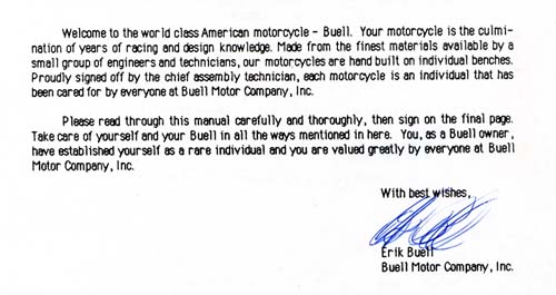 1987 baute Erik Buell die RR1000 Battletwin in einer Auflage von 52 Stück. Eine davon kam mit einem Meilenstand von 229 im Mai 2007 ins Ebay. Von dort stammen die Bilder und die Vorlage der Übersetzung: